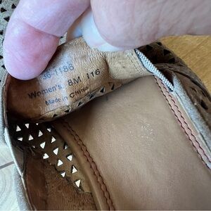 Womens 8M, pewter leather upper, perforated style, leather lining and outsole, slip on.