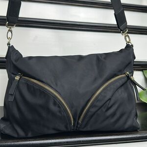 This quality travel crossbody bag is versatile and can be carried a variety of ways. The nylon on this bag is soft and has no holes or scrapes and is easy to wipe clean. One side of the bag has a snap closing pocket that is spacious and versatile. The other side of the bag has a zipper pocket and two additional zipper accent pocket for great organizing. The removable Crossbody shoulder strap is adjustable and has gold toned details. The satchel handles are comfortable to carry, and have no sign of wear. The handles can be snapped together with a mechanism that is already attached, and this bag can be carried as a large tote… (See photos) or folded over and carried more as a handbag or Crossbody. 14” across the top. 17” tall (expanded ) base is approximately 4” wide. Just grab and go!