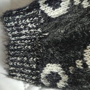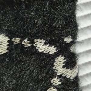 Very soft almost eyelash material. Cable knit Cuffs and hem.