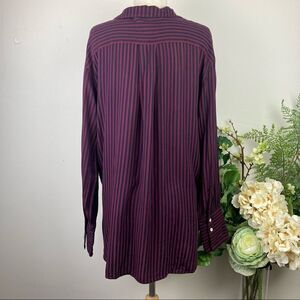 This loose-fitting tunic with classic menswear detailing easily styles from day to night. Long sleeves. Button down. Deep V Neck. Maroon and navy blue stripe.