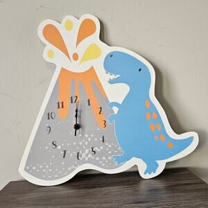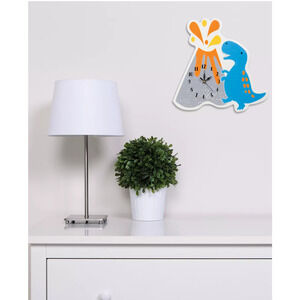 Complement any room with the stylish Dinosaur Volcano Clock by Trend Lab. This clock features an adventurous blue dinosaur and a gray volcano with orange and yellow lava. Black numbers add the finishing touch.