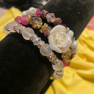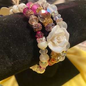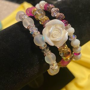 Colors: magenta, Marv, must green, crystal clear, opaque. Features: stretch cord, three strands, lobster clasp, And as always signature metal heart.