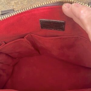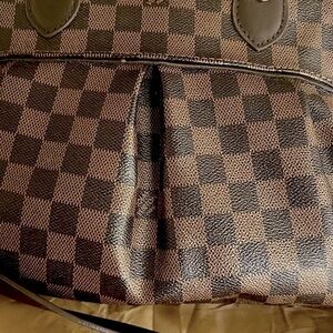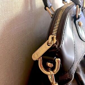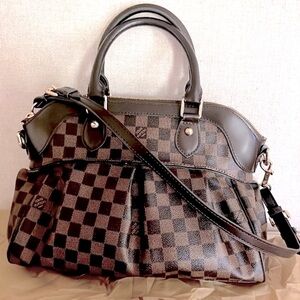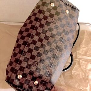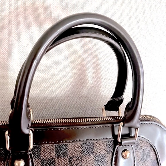 Gorgeous brown Brevi checkered satchel handbag is very weighty, sturdy and spacious, has two short handles along with the detachable longer strap measuring 29”- shoulder, not a crossbody strap. Gold hardware, red felt inside lining with two small pockets. Measures 14”L x 11”H x 5”D. Kept in a dust cover bag. Has a tiny tarnish on side link shown. No other flaws. New, never been used.