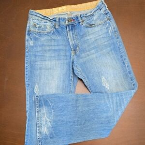 These jeans feature a classic blue hue with a straight cut, offering a timeless and versatile style. The natural distressing and subtle whiskering add a casual, lived-in look, perfect for everyday wear. Crafted from standard weight denim, they promise comfort and durability.
