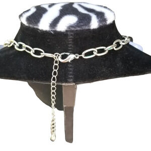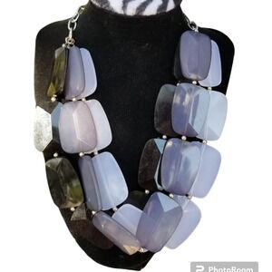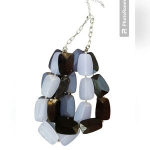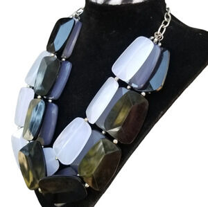 Fashionable chic necklace with black, white, and grey/purple acrylic in a three chained layered style. Necklace measures 20 inches in length with a 3 inch extender chain. Necklace is in fairly good condition with a lot of surface scratches on acrylic.