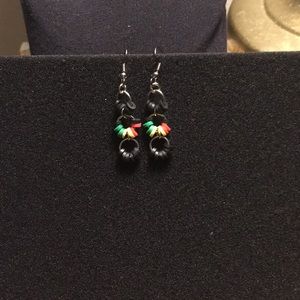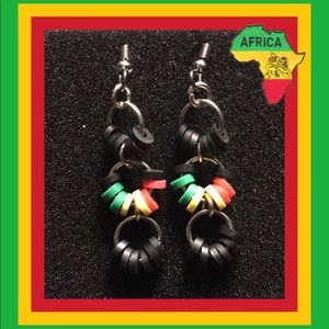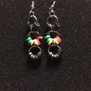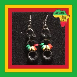 3 hooped Rasta themed African Ghanaian vinyl heishi bead earrings. Also known as vulcanite beads, these beads are traditionally made using recycled phono records cut up in a sequin-like fashion.Handmade on stainless steel French hooks.