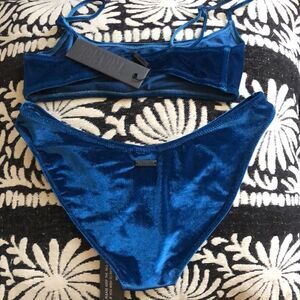 A scoop crop bikini top in velvet with matching NORMAL cut bottoms. Strappy crop top with adjustable shoulder straps and back clasp fastening..