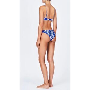 A ruched scoop crop bikini top in blue and white floral with matching bottoms. Strappy crop top with adjustable shoulder straps and back clasp fastening.