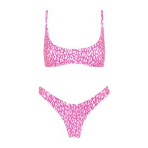 A printed scoop crop bikini top in pink leopard with matching NORMAL cut bottoms. Strappy crop top with adjustable shoulder straps and back clasp fastening.