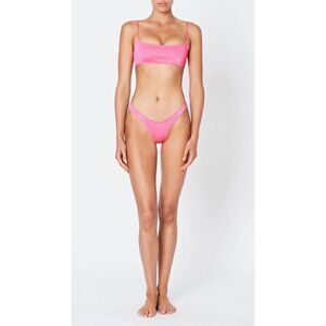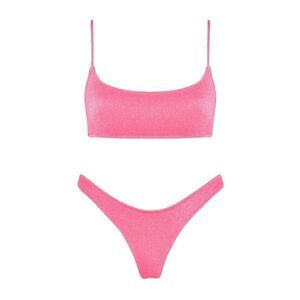 A scoop crop bikini top in pink lurex sparkle with matching bottoms. Strappy crop top with adjustable shoulder straps and back clasp fastening. CHEEKY cut bottom.