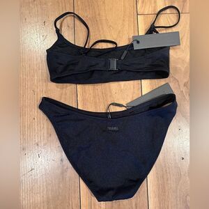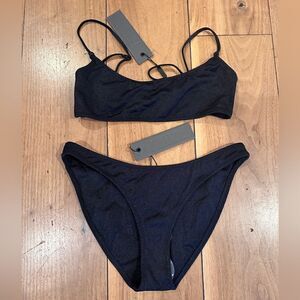 A scoop crop bikini top in black with matching bottoms. Strappy crop top with adjustable shoulder straps and back clasp fastening. NORMAL cut bottom.