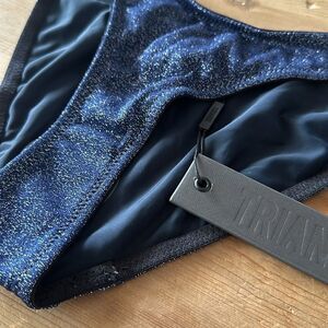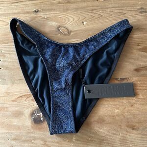 Shiny nylon spandex BOTTOM ONLY in midnight blue lurex. NORMAL cut bottom for just slightly more coverage though IMO they are still pretty cheeky. See pics for reference