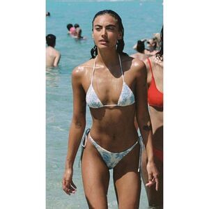 A textured pattern side-tie bikini in blue and white floral. Note it’s not a bright white, there’s a tinge of yellow or beige. Fully adjustable triangle top and bottoms with self-tie fastenings.