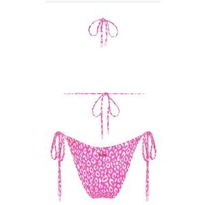 A printed side-tie bikini in pink leopard. Fully adjustable triangle top and bottoms with self-tie fastenings.
