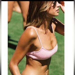 A crop bikini TOP ONLY in pink terry towelling. Strappy crop top with adjustable shoulder straps and back clasp fastening. This listing is for the TOP ONLY