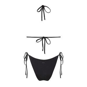 A side-tie bikini in black. Fully adjustable triangle top and bottoms with self-tie fastenings. This bikini also comes with a neoprene drawstring backpack 😎