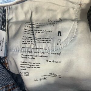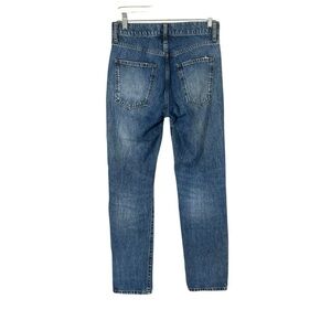 TRIARCHY High Rise Slim Fit “Loose Skinny” Straight Leg Jeans. High waist, dropping down to a loose slim straight leg. Made from our signature bio-stretch denim, there are no micro-plastics or any artificial threads in these jeans. Sustainably made 100% cotton. Gold button and zip fly. Light distressing along edges. Full length.