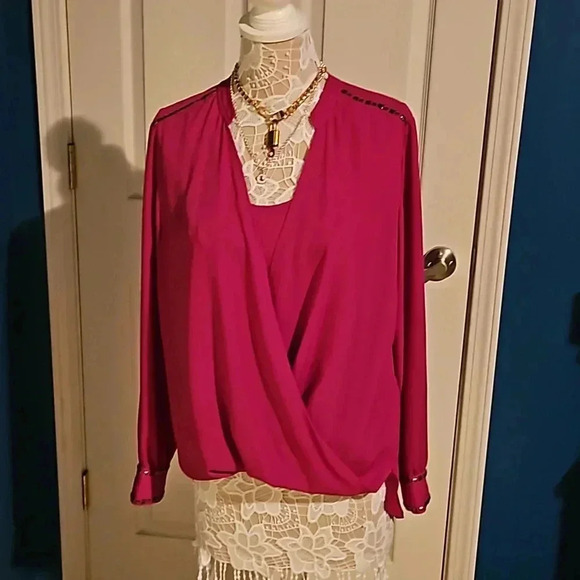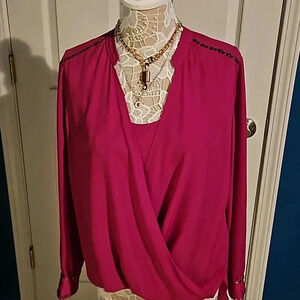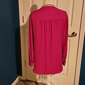 Tribal Fuschia Blouse. There's studs across the shoulder and at the wrist. There's buttons at the wrist with the studs. EUC