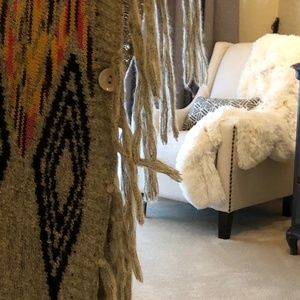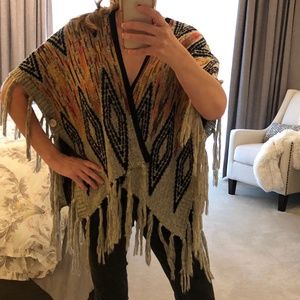 The tribal pattern + long fringe provides the trendy and the button arm closure provides the function.