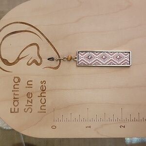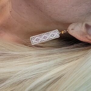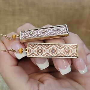Long patterned dangles with faceted subtle shimmer down the center. Nicely weighted goldtone; wooden bead accent; hypoallergenic wires.