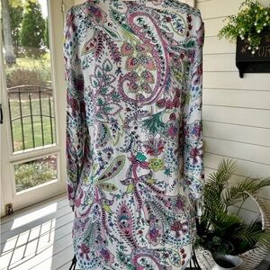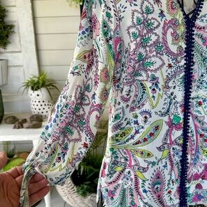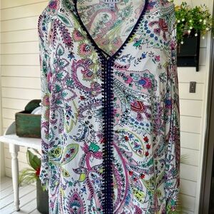 TRIBAL, WOMENS, RAYON/SPANDEX, V-NECK TOP. 3/4 SLEEVE WITH TIE KNOT, NAVY BLUE EMBROIDERED NECK TRIM & FRONT. HI-LOW HEM WITH SIDE SLITS. MULTI-COLOR PAISLEY DESIGN. SIZE P/S