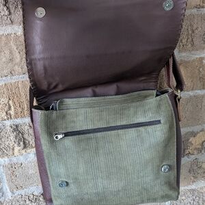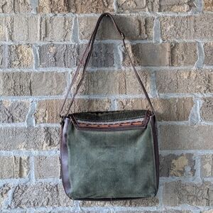 Excellent preowned condition boho patchwork leather messenger bag from Tribu. Brown textured leather with knit sweater patchwork. Olive green and brown color way. Bohemian academia. Adjustable crossbody strap. Unisex. Clean. No flaws.