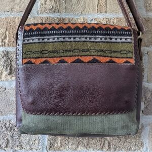 TRIBU Knit Leather Patchwork Boho Messenger Bag Brown Olive Green