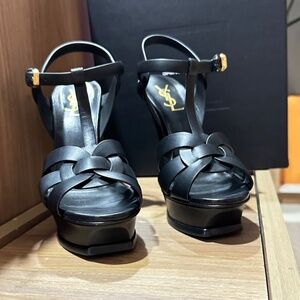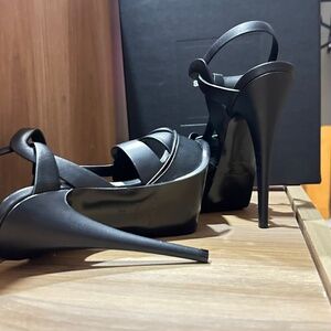 HIGH HEEL STILETTO SANDALS WITH INTERTWINING STRAPS MADE WITH METAL-FREE TANNED LEATHER, FEATURING A BEVELED PLATFORM, COVERED HEEL AND ADJUSTABLE ANKLE STRAP ENGRAVED WITH SAINT LAURENT PARIS.