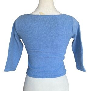 TRICOTTO knit wear. Blue fitted crop top with embellishments at hemline, short sleeve, square neck.