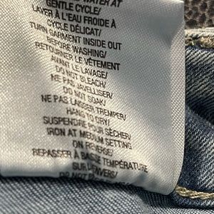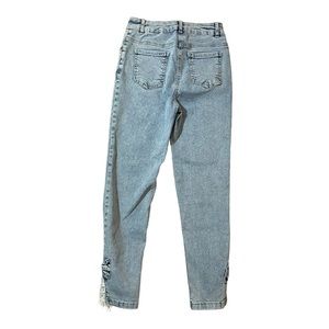 High fashion 5 pocket jean with side sequin, bow and lace hem detail. Button and zipper front with belt loops. Hand wash cold water, 97% cotton-3% elasthane. Approx. 11 inch high ride with 26 inch inseam