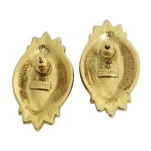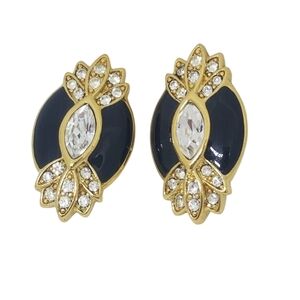 Beautiful art deco revival style earrings by Trifari. Earrings are from the 90s, they are goldtoned and detailed with black enamel and glass crystals. Earrings measure 1-1/4 inches tall and 3/4 inch wide. Earrings are in excellent condition and stamped Trifari on the backs.