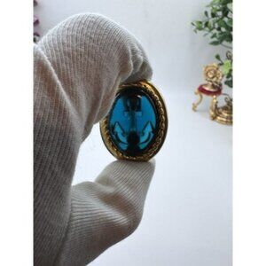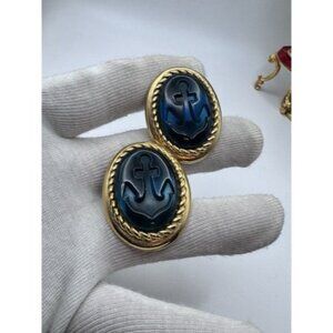 These TRIFARI TM earrings feature a sophisticated design with blue cabochon plastic stones set in an elegant oval shape whit anchor design. They are clip-on style earrings with a gold tone metal finish, showcasing a vintage aesthetic. The Trifari TM brand signature adds authenticity to the piece.