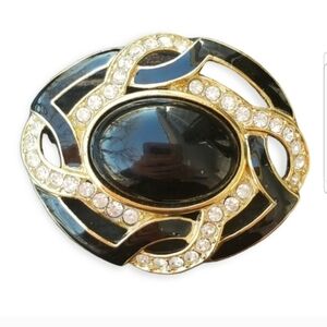 TRIFARI VINTAGE 1990s GOLDTONED BROOCH WITH RHINESTONES & BLACK ENAMEL DETAIL