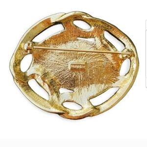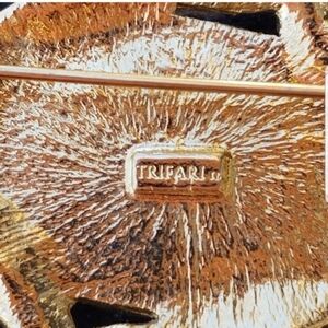 Beautiful goldtoned brooch by Trifari has black enamel and cabochon detail with cz crystals. Brooch is stamped Trifari on back and measures 2-1/8 inches wide and 1-7/8 inches tall. Brooch is in excellent condition.
