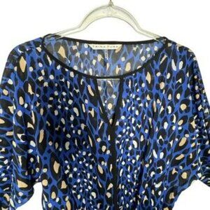 Stylish, silk, dolman blouse with a vibrant blue and black spotted pattern. Features a unique design with a keyhole neckline. Stretch at waistband.