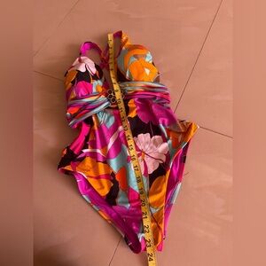 Questions? Leave a comment below! Trina Turk Gemini Halter Plunge Top One Piece Swimsuit in size 10. This multicolored swimsuit features a vibrant floral pattern with a plunging neckline and a decorative gold-tone medallion at the center bust. The swimsuit also has adjustable halter straps and a contrasting print border under the bust. It is made of 83% polyester and 17% spandex, ensuring flexibility and comfort. The swimsuit is fully lined and has removable cups for added suppor