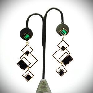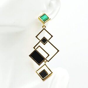 Trina Turk gold plated, faux malachite, black enamel, and black leather dangle earrings are 1.5" wide at widest point, 3.5" long with butterfly fastenings.