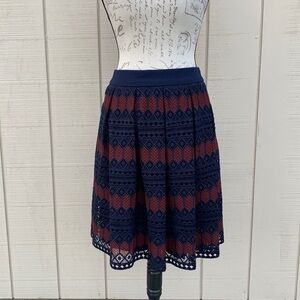 A gorgeous full skirt with an embroidered pleated lace body and full lining. Side zip. Banded waist. Hits just above the knee.