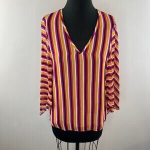 Trina Turk Los Angeles Blouse Multi Striped Printed Rayon Rib V-Neck Size Small