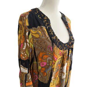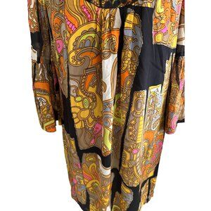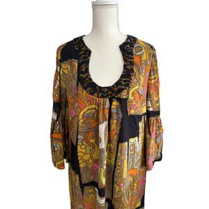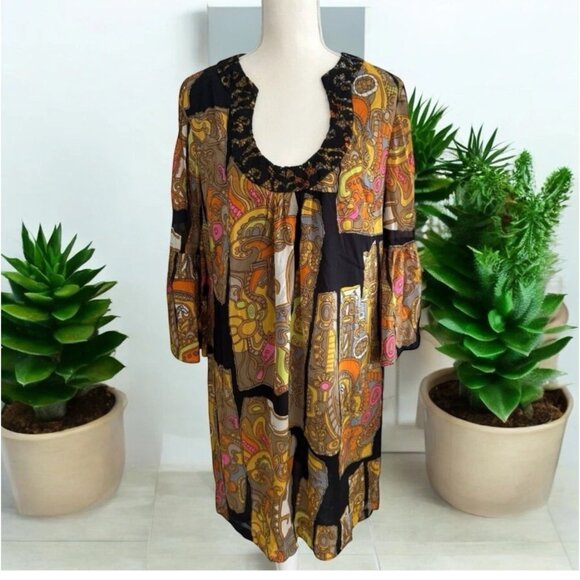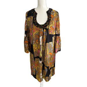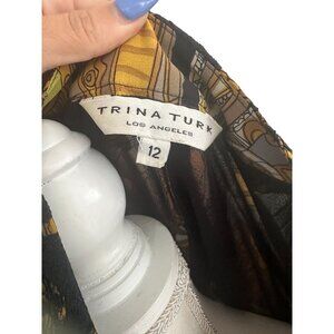 This vibrant Trina Turk swing dress features a bold multicolor pattern, perfect for making a statement. The dress is designed for a flattering fit and flowy movement, ideal for brunch or a day out.