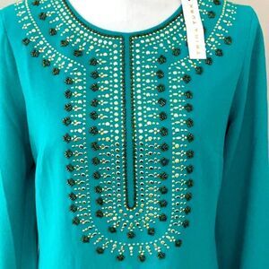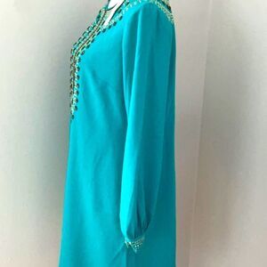 TRINA TURK NWT TURQUOISE KAPONO BEADED CREPE LONG SLEEVE SHIFT DRESS SIZE 8
