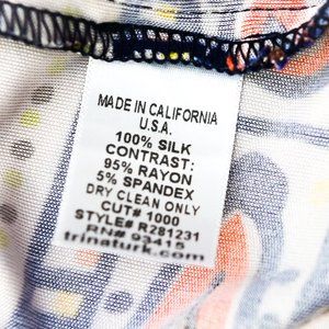 Body of dress is soft, fluid 100% silk; trim is 95% rayon & 5% spandex