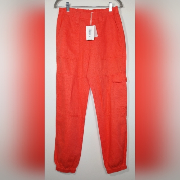 New Women's Trina Turk Out Of Office Diversion Linen Pants, Great Condition, Small Pin Size Holes, One On Top, The Rest On Bottom, Fire Stick Color, Size XS.