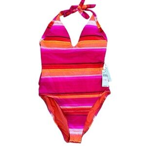 TRINA TURK Pink Orange Solstice Stripe Plunge Halter One Piece Swimsuit Size 14
