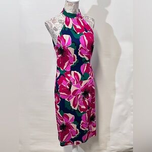 Pink floral EMOTION halter sheath dress from TRINA TURK, size 6. Dress has form flattering pintucking at waistline and zip back.