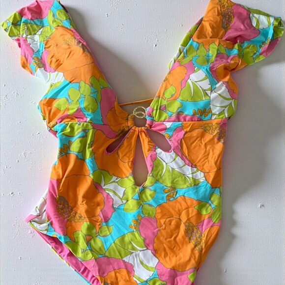 TRINA TURK Playa De Flor Plunge Maillot One-Piece Swimsuit Size 10 Floral Cutout