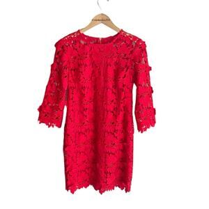 Gorgeous crochet lace steals the show in this 3/4-sleeve dress from Trina Turk, featuring an exposed zipper at the back.