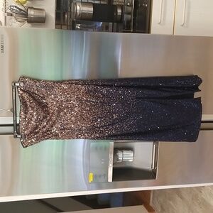 Glamorous and radiant, this strapless, sequined gown features a bodycon silhouette, midi-length, high left slit, and shimmering sequins in an ombré gradient of bronze and black. Add statement earrings and heels for a showstopping look.