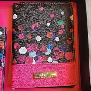 New in box, black with hot pink and multi-color dot pattern travel set, passport cover and matching luggage tag. Great gift for the travel lover!