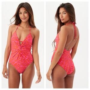 This one-piece swimsuit features a sleek fit and a unique twisted front with an adjustable spaghetti strap halter neck and a low back. Pair this vibrant pink and red print one-piece with a kimono in a complementary print for vacation-ready style.